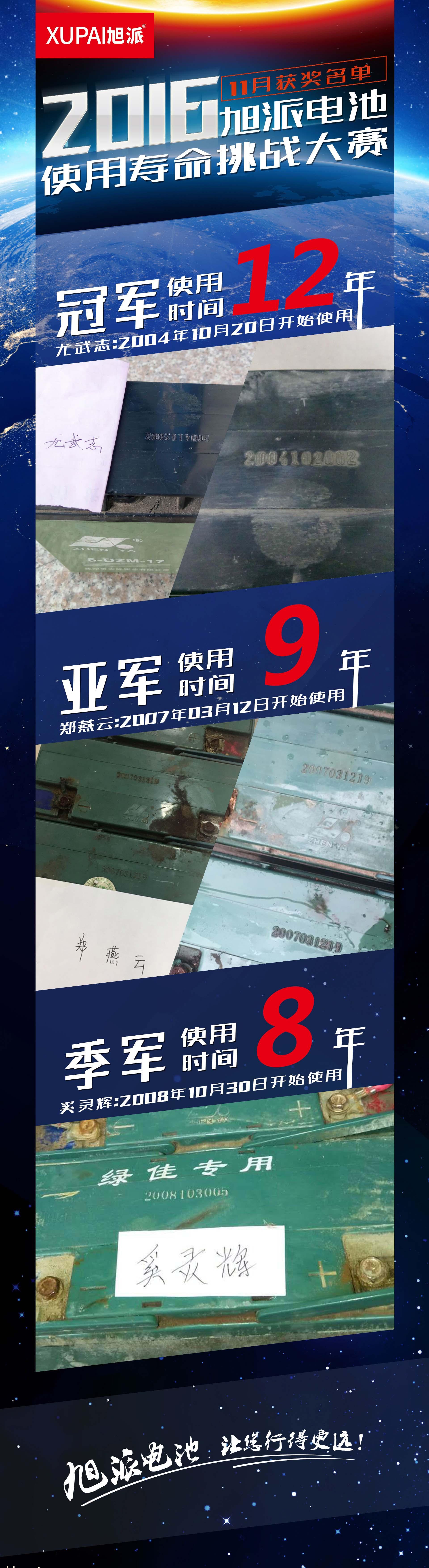 时间飞逝,旭派电池使用寿命挑战大赛已经陪伴我们走过了2016年的11个月度,剩下最后1个月的时间,把握最后一次中奖的机会哦~~如果你心动了,那就赶紧行动吧!