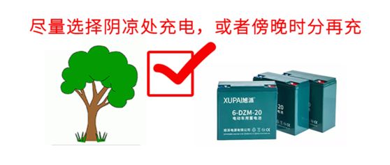 尽量在阴凉处给电池充电,或选择在傍晚的时候给电动车充电。电池在充电过程中也会发热,如果在太阳直射的情况下充电,也会导致电池失水,对电池造成损伤。