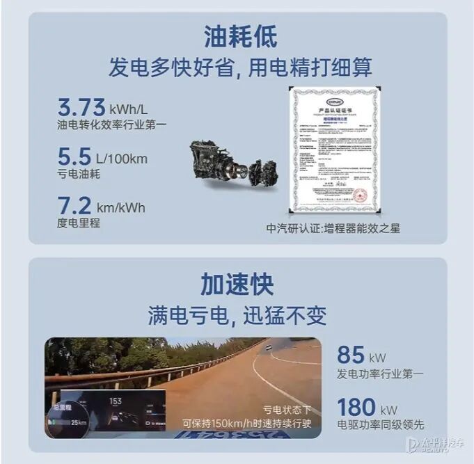 5.续航里程:纯电版提供容量为62.268千瓦时和75.26千瓦时电池组可选,CLTC纯电续航分别为530km和650km;增程版配备容量为29.165千瓦时电池组,CLTC纯电续航210km;
