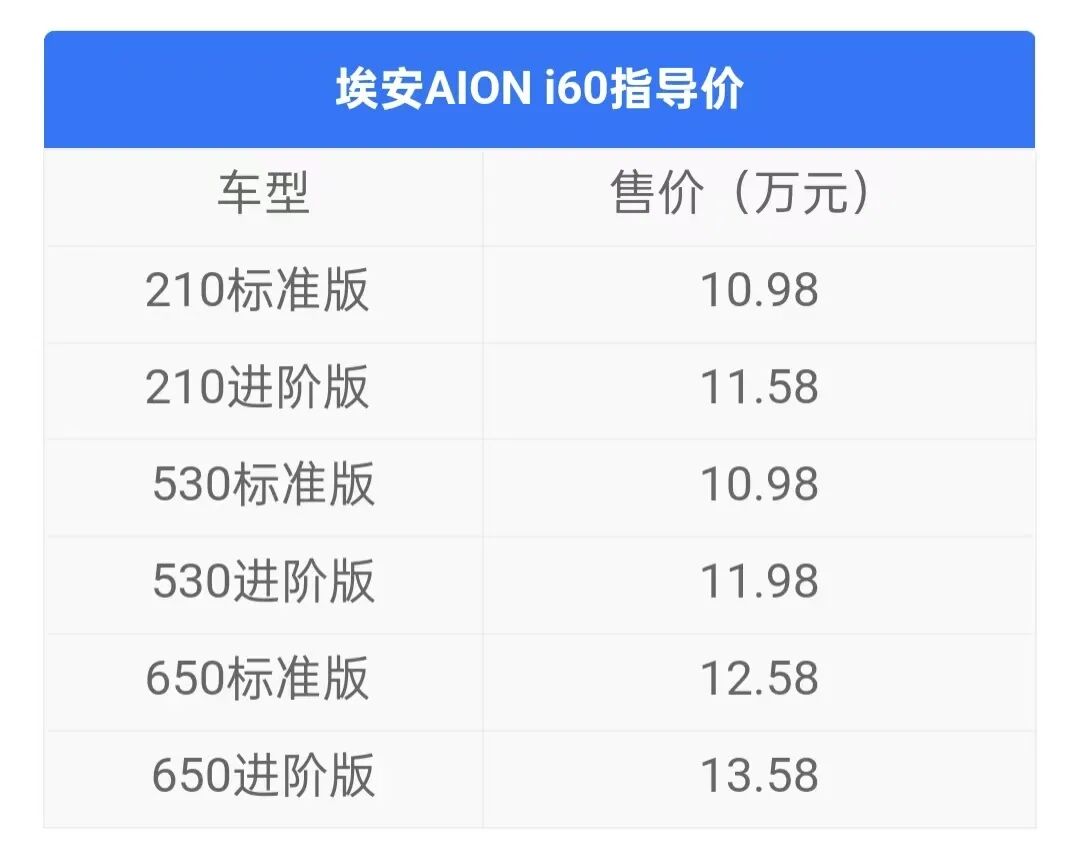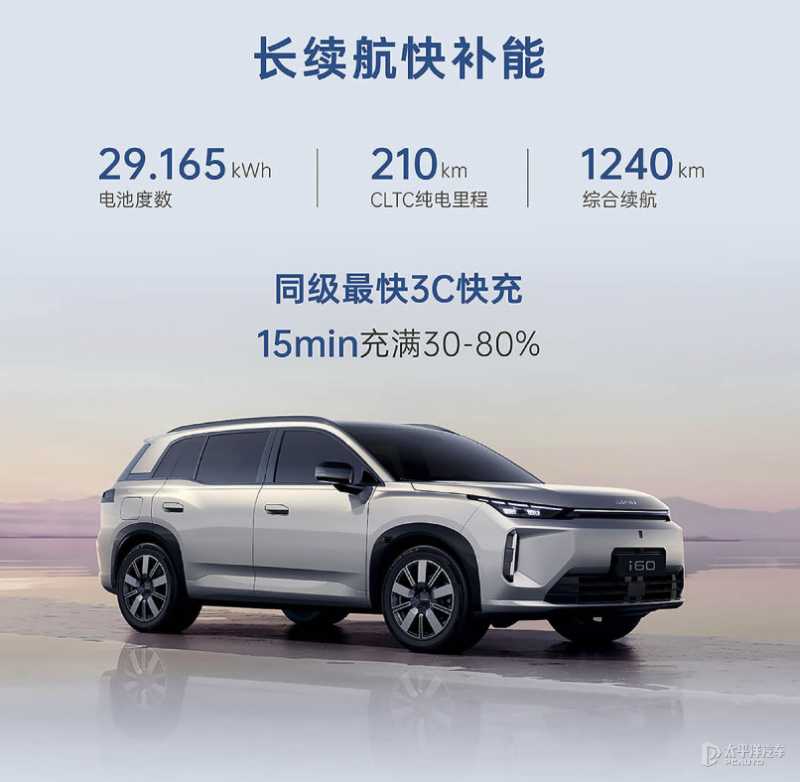 11月16日,广汽埃安AION i60正式上市,新车共推出6款车型,官方指导价区间为10.98-13.58万元,限时焕新价10.48-13.08万元。作为广汽埃安首款增程+纯电产品,埃安AION i60定位紧凑型SUV,提供纯电和增程动力可选,纯电版CLTC纯电续航最高650km,增程版搭载1.5L增程器,CLTC纯电续航210km,CLTC综合续航1240km。